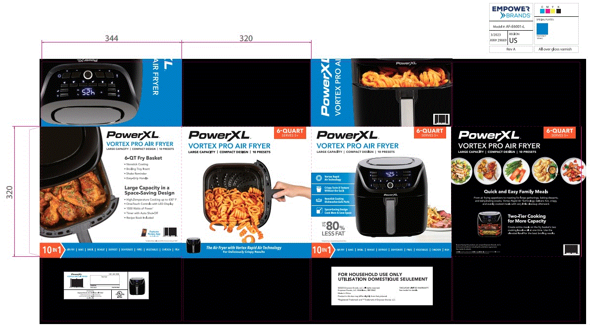 The quick, crispy way to make family-size meals. The PowerXL™ Vortex Pro 6 QT Air Fryer with Vortex Rapid Air Technology circulates supercharged hot air 360° around your food for deliciously crispy, evenly cooked meals 91% faster†. Whether you’re air frying crispy snacks and appetizers, dehydrating fruit, baking desserts, or roasting chicken for large gatherings, the Vortex Pro Air Fryer has spacious capacity that fits up to 4-lbs. of French fries in a compact, space-saving, easy-to-store design. For an extra-crispy finish, the two-tiered fry basket’s upper level allows you to achieve perfect broiling results or cook a main dish and sides all at one time on the upper and lower levels for a complete meal. Just touch one of the 10 Quick-Touch Presets on the Digital LED Panel to cook what you want, when you want it, or program your own cook time and temperature in a snap. If you’re short on time, cook frozen foods without waiting for your food to thaw. After you’re finished, wipe the nonstick fry basket and fry tray clean or load them into the dishwasher. Durability guaranteed with our 1-year Limited Warranty.