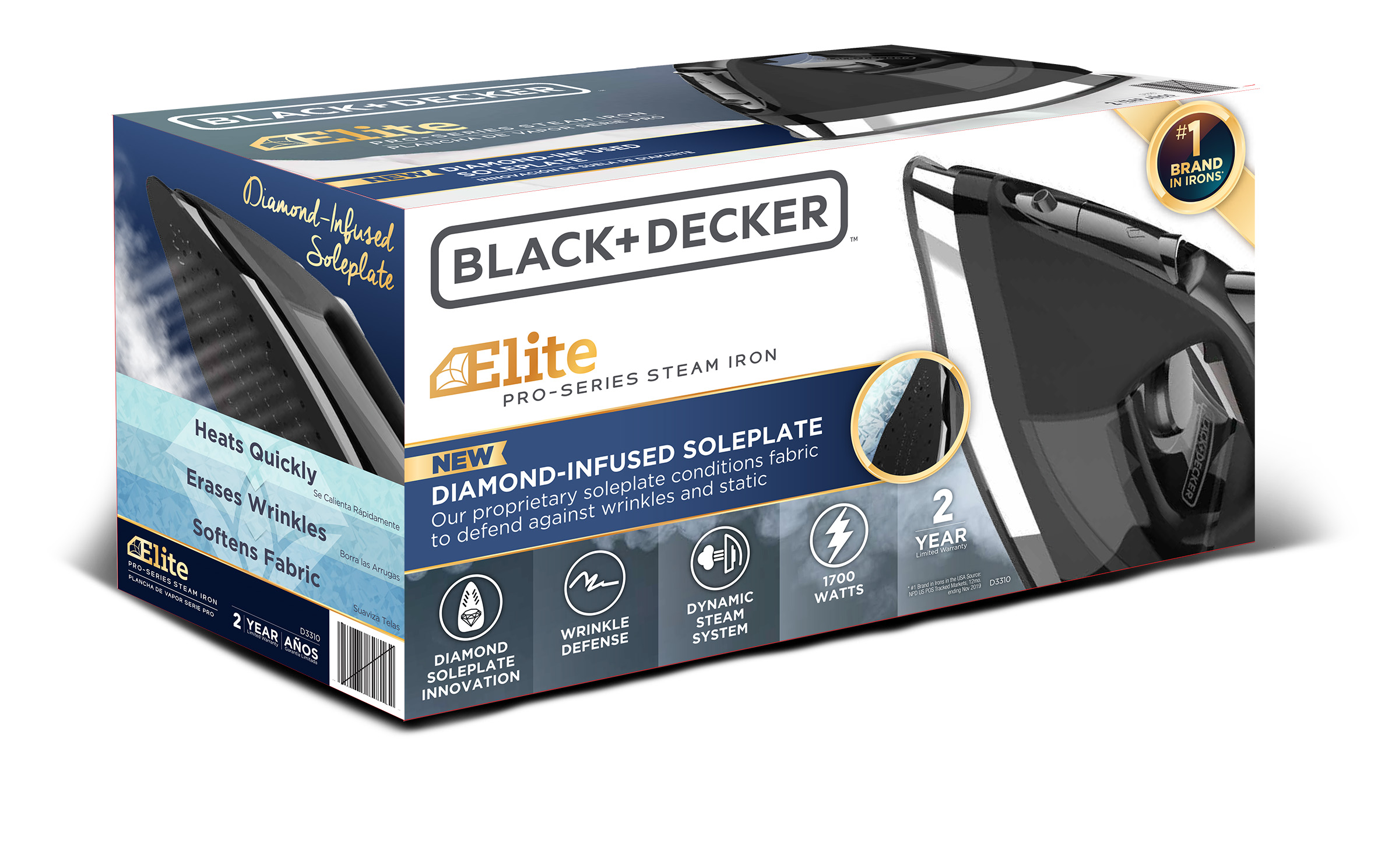 • Diamond Infused Soleplate – conditions fabric to defend against wrinkles