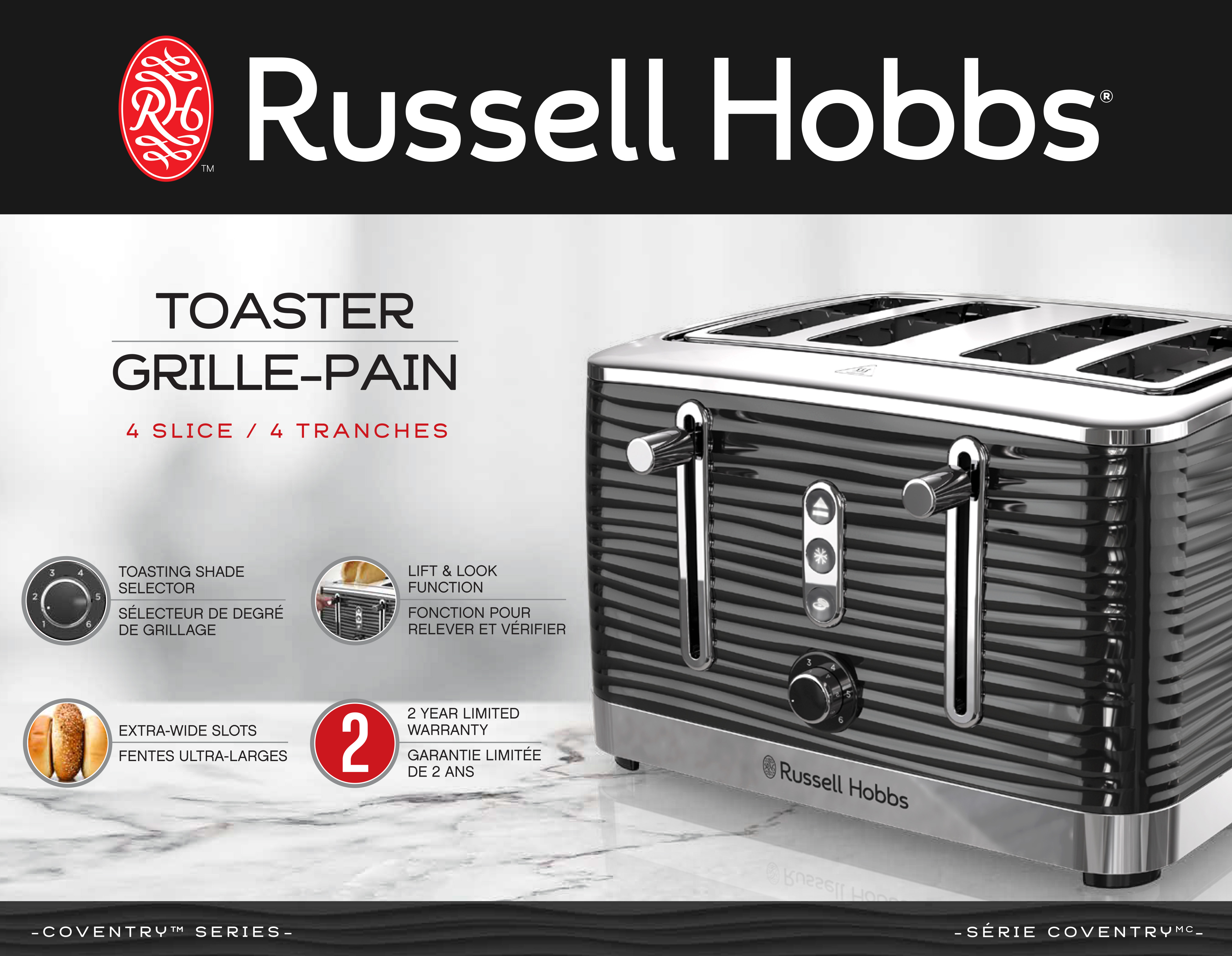 The Russell Hobbs Coventry 4-slice toaster brings premium aesthetics to your kitchen. The variable browning control ranges from 1 (light) to 6 (dark) to satisfy all preferences. Choose the bagel function for a perfectly toasted cut side with a warmed bottom side, or the frozen setting for fresh-like results. This toaster comes with a removable warming rack that quickly heats buns, pastries, and rolls. Plus, the removable crumb tray ensures easy cleanup.